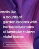 lavanda + violetta è una fragranza fresca e floreale con note di lavanda e foglie di violetta rugiadose. profuma di un’abbondanza di fiori da giardino.